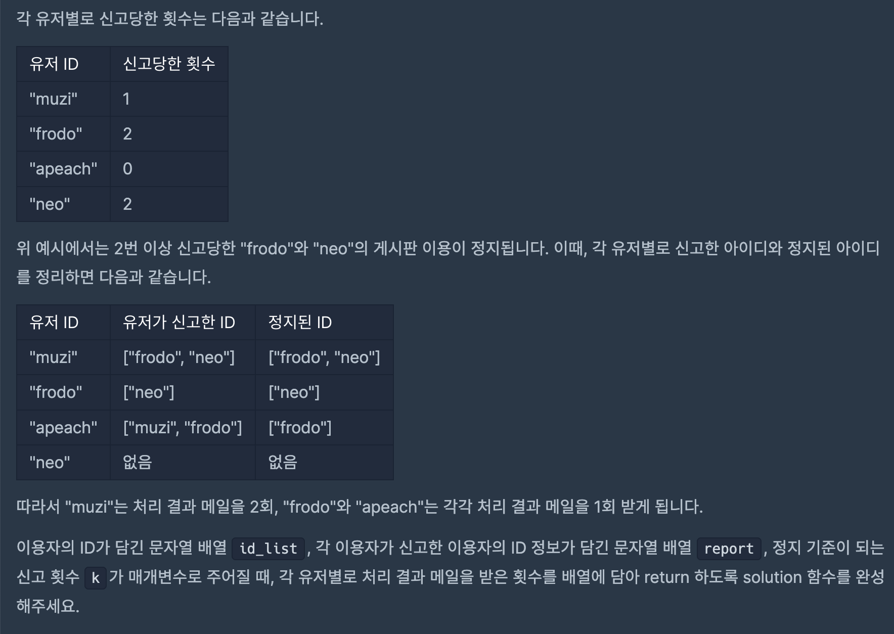 그래서 reportCount 딕셔너리에는 id를 key로, set을 value로 만들어 신고한 사람이 총 몇 명인지 셀 수 있게 해주었다.