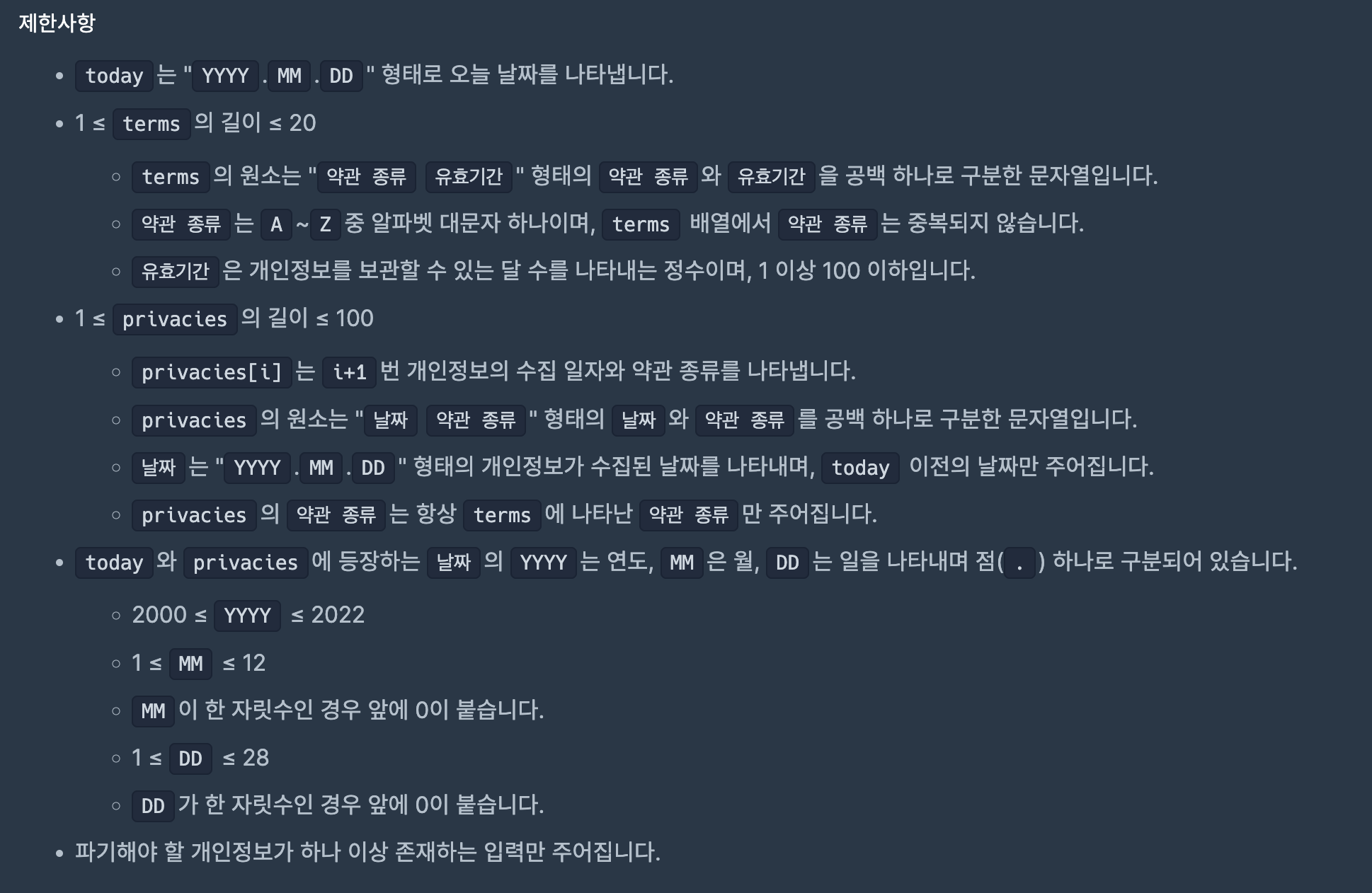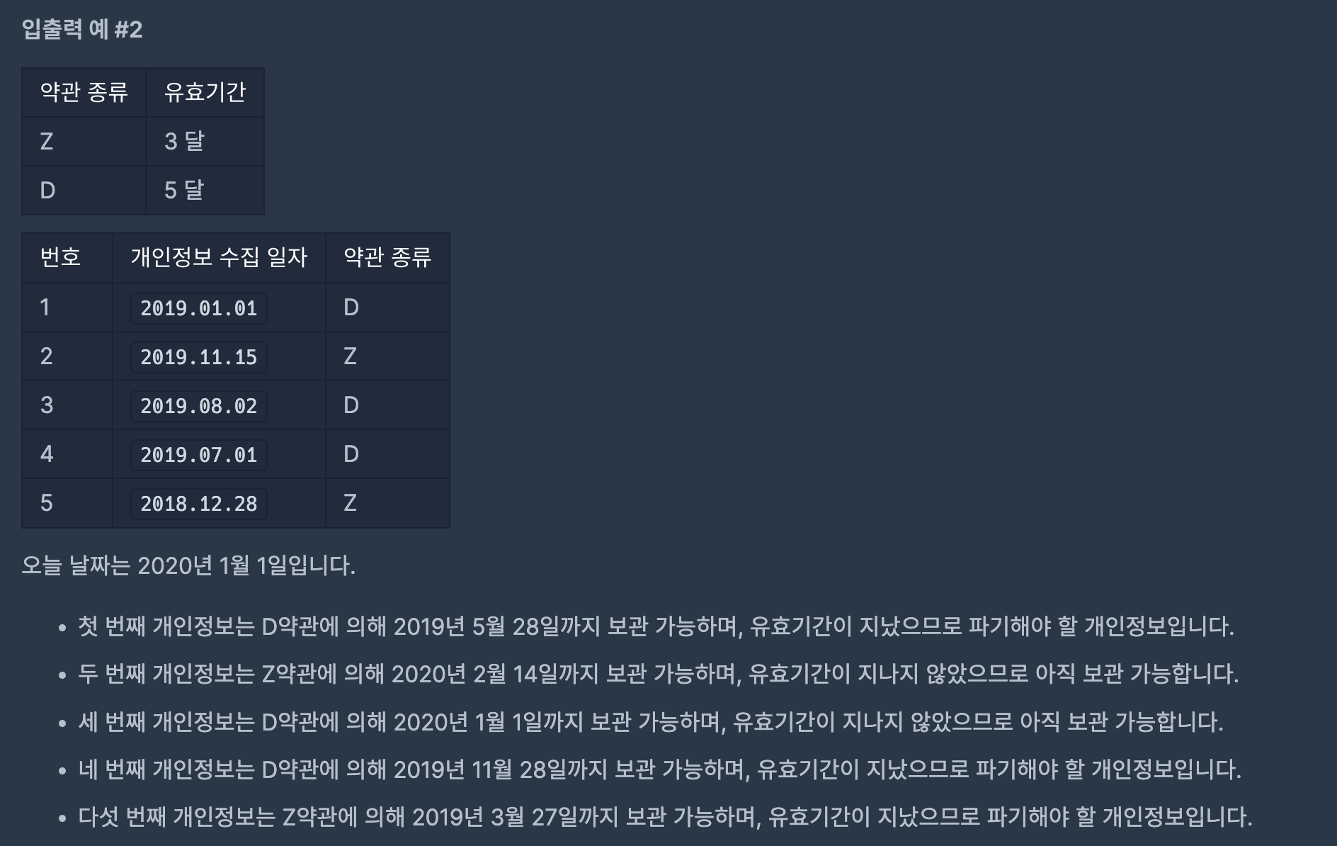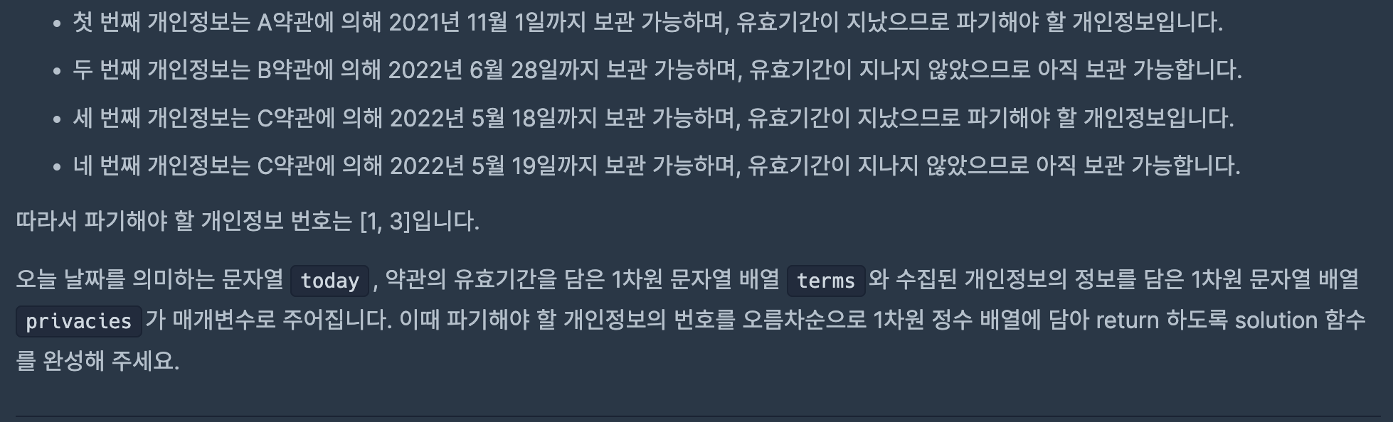 문자열을 마침표를 기준으로 분해하고, 오늘을 기준으로 문서 작성일로부터 보관 기한을 더하면 그것이 몇일인지 파악하고, 오늘과 비교하여 파기해야 하는 것인지 아닌지를 리턴해주면 된다.