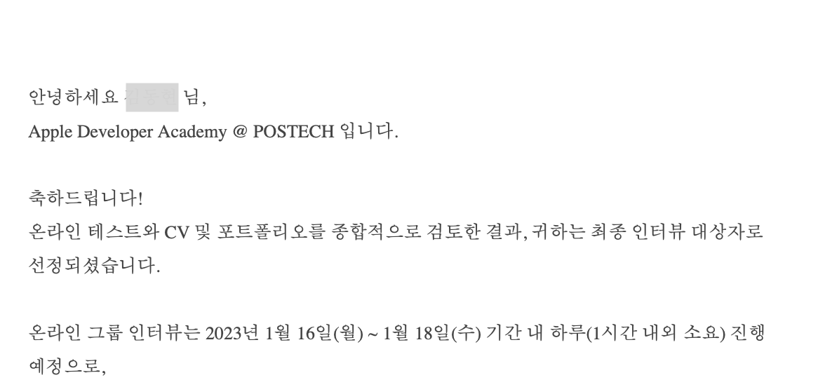 | Apple Developer Academy 2기 '테크' 지원 합격 후기 - 4. 면접, 최종결과 편 (0) | 2023.01.30 |