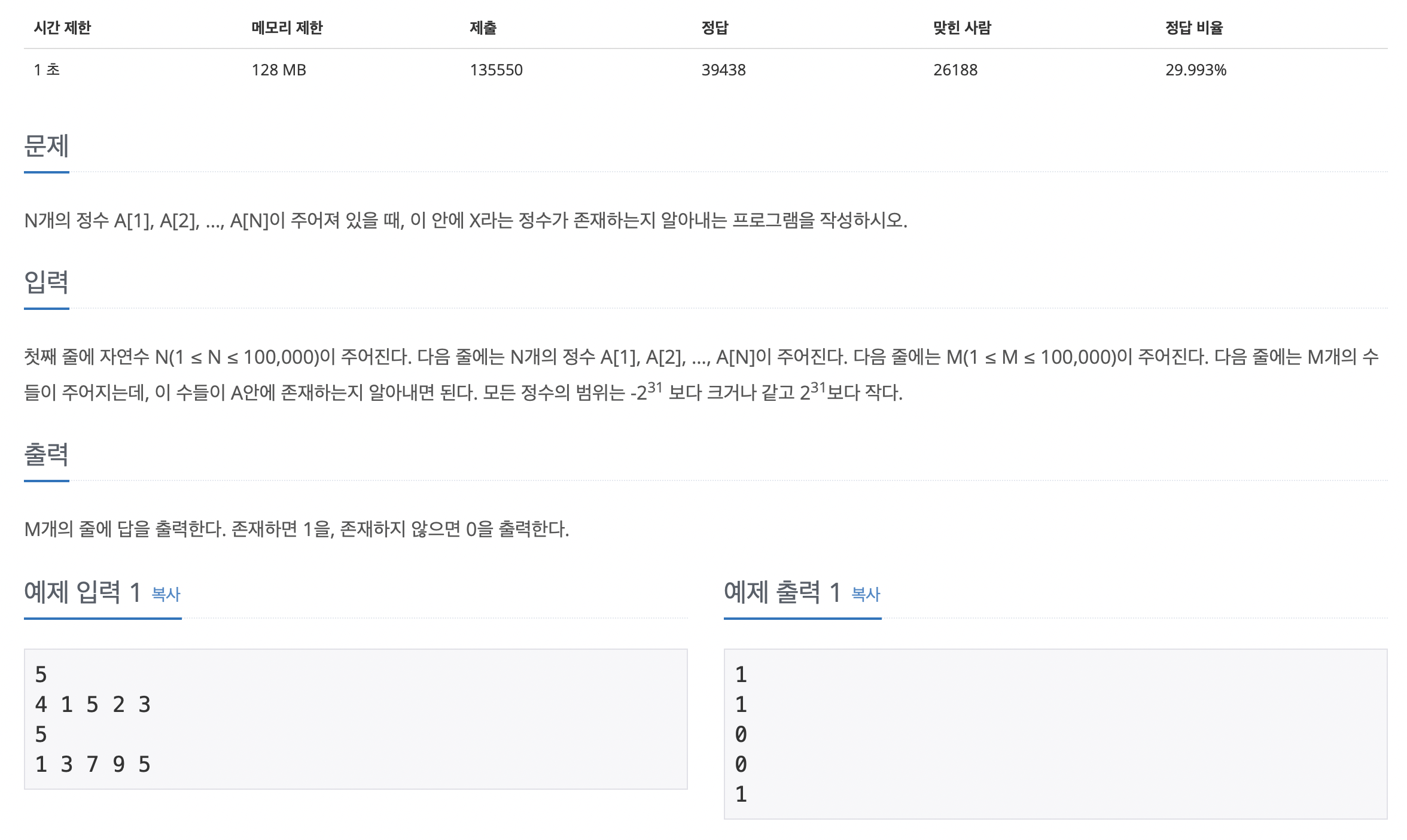 10816번은 카드의 수를 세는 것이지만, 이 문제는 있는지 없는지 여부만 확인하면 되기에,