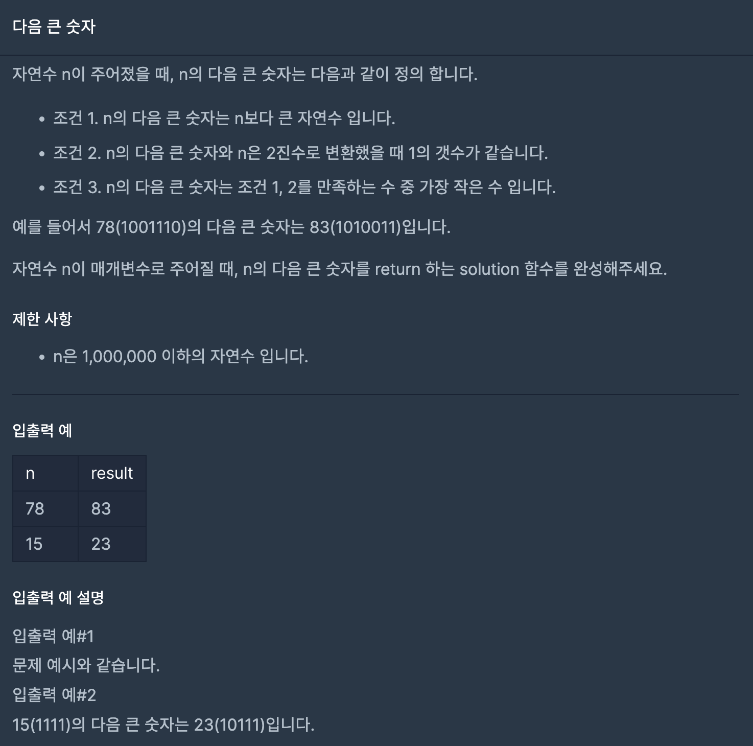 일단 1을 카운팅하는 변수를 두고, 현재 숫자에 1을 더하고, 그것을 이진수로 바꾼 뒤에 1의 개수를 셌는데 같다면 그 숫자를 리턴해준다.