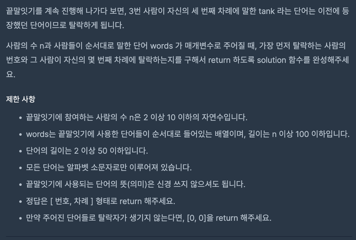 if 문 내부의 if문은 중복 단어가 있을 경우 바로 return을 해주는 부분이며, 중복된 단어가 없다면 appearWord에 단어를 계속 넣어주게 되어 있다. else문은 현재 단어의 마지막 글자와 다음에 나올 단어의 첫 글자가 다를 경우, 들어오게 되는데, 여기에서도 현재 단어가 등장했다면, 현재 말하고 있는 사람이 잘못된 단어를 말한 것이므로 현재 사람의 loop와 person을 출력해주고, 그것이 아니면 다음 사람의 person과 index를 출력해주면 된다.