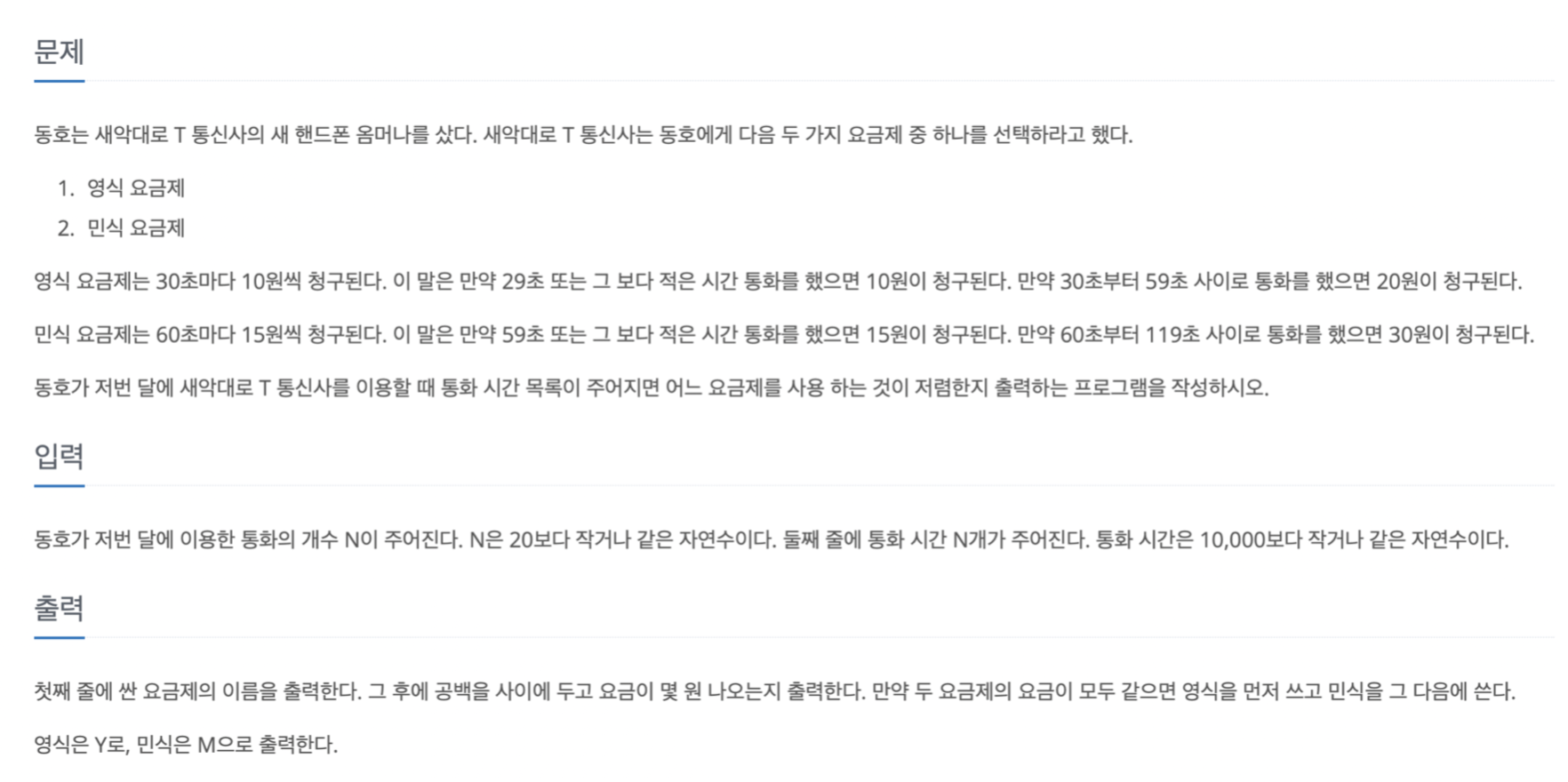 발상은 간단하다. 각 요금제가 월 요금을 계산하는 식을 쓰고, yfee, mfee라는 총합을 받는 변수에 그 결과값을 담아서