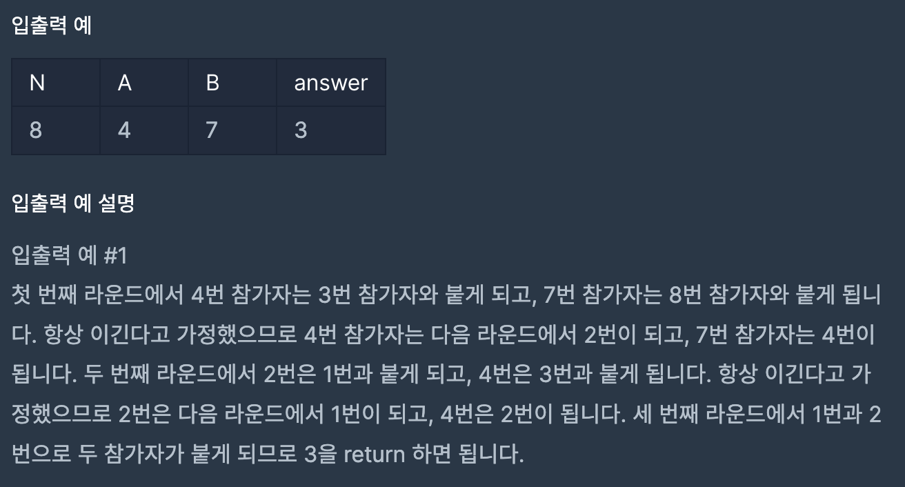 그러면 나머지를 구해보면 innerA가 2로 나눈 나머지가 0, 그리고 innerB가 2로 나눈 나머지가 1이며, 두 개의 차이가 1일 경우, 서로 맞붙게 되는 상황이 되는 것이다. 이런 조건을 만족시킬 때까지 while문 안에서 answer를 하나 씩 누적하여 더해주고, innerA, innerB를 2로 나누어가면서 반복을 돌려준다.