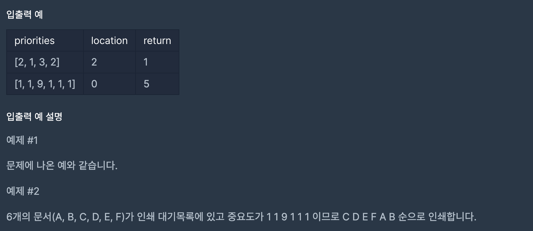 우선순위가 들어있는 배열이 주어지고, 내가 출력하고자 하는 프린트의 location이 주어진다.