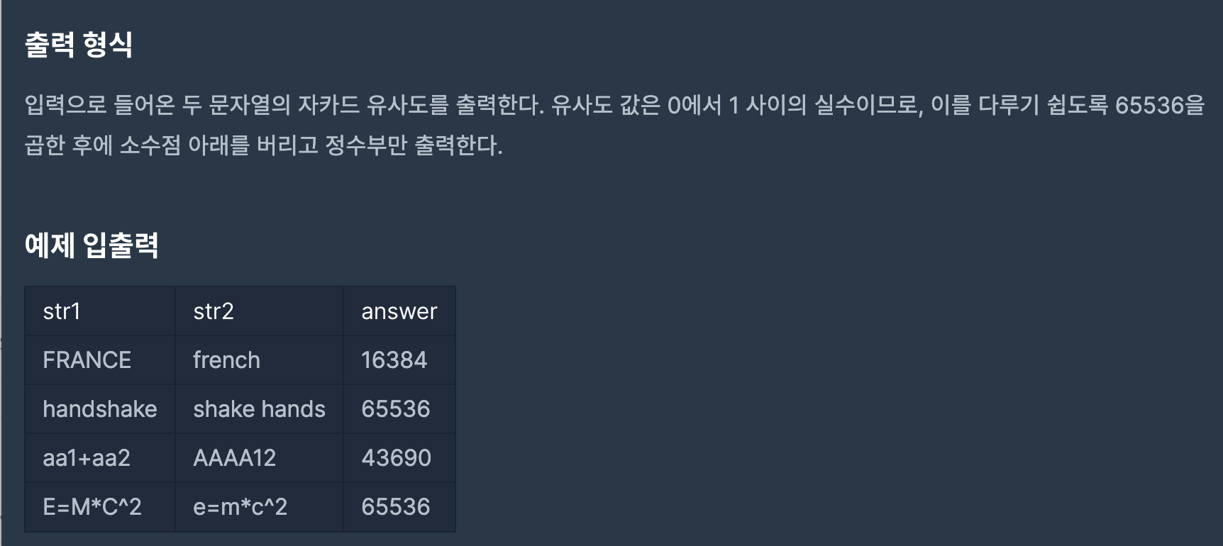 교집합에 해당하는 것을 체크하기 위해 similar1, 2에 있는 것 중 겹치는 것은 "" 으로 표현하였다. 나중에 ""의 개수를 세면 교집합이 되는 것이고, wholeCount에서 교집합의 수를 제하면 합집합의 수가 된다.