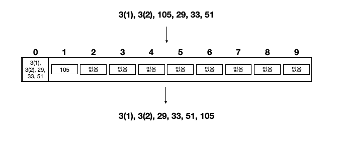 한 자리 수인 3의 경우 10의 자리수는 당연히 0이다. 그래서 0쪽의 bucket에 가서 담긴 것이고, 105는 순서상 마지막에 담길 수 밖에 없었다.