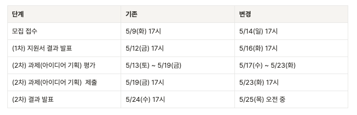 새싹톤의 일정은 위와 같았다. 지원자를 더 모집하기 위해서인지, 일정이 변경되어 진행이 되었다. 1차 지원서를 내고, 2차 과제를 낸 후 결과 발표에 따라 개발을 진행할 지 말지가 결정되는 상황이었다.