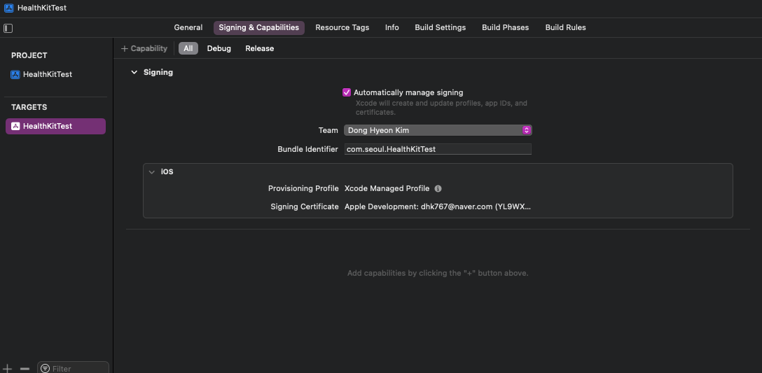 All 옆에 있는 +Capability를 눌러서 HealthKit을 추가해 주어야 한다.