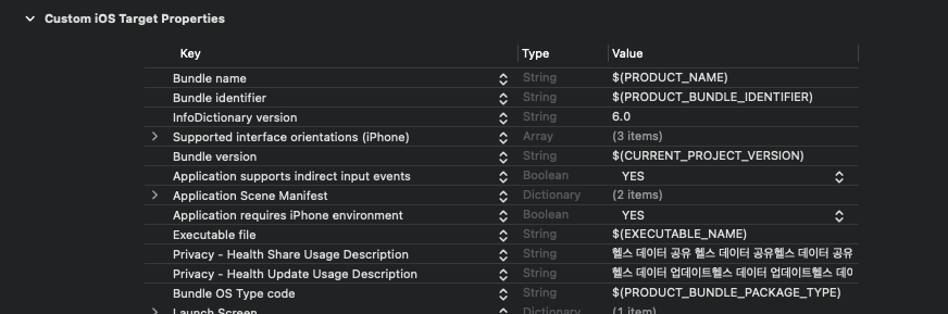 마찬가지로 Target의 Info 부분에서 Privacy - Health Share Usage Description을 넣어 주어야 한다. Privacy - Health Update Usage Description도 설정해 주어야 한다.