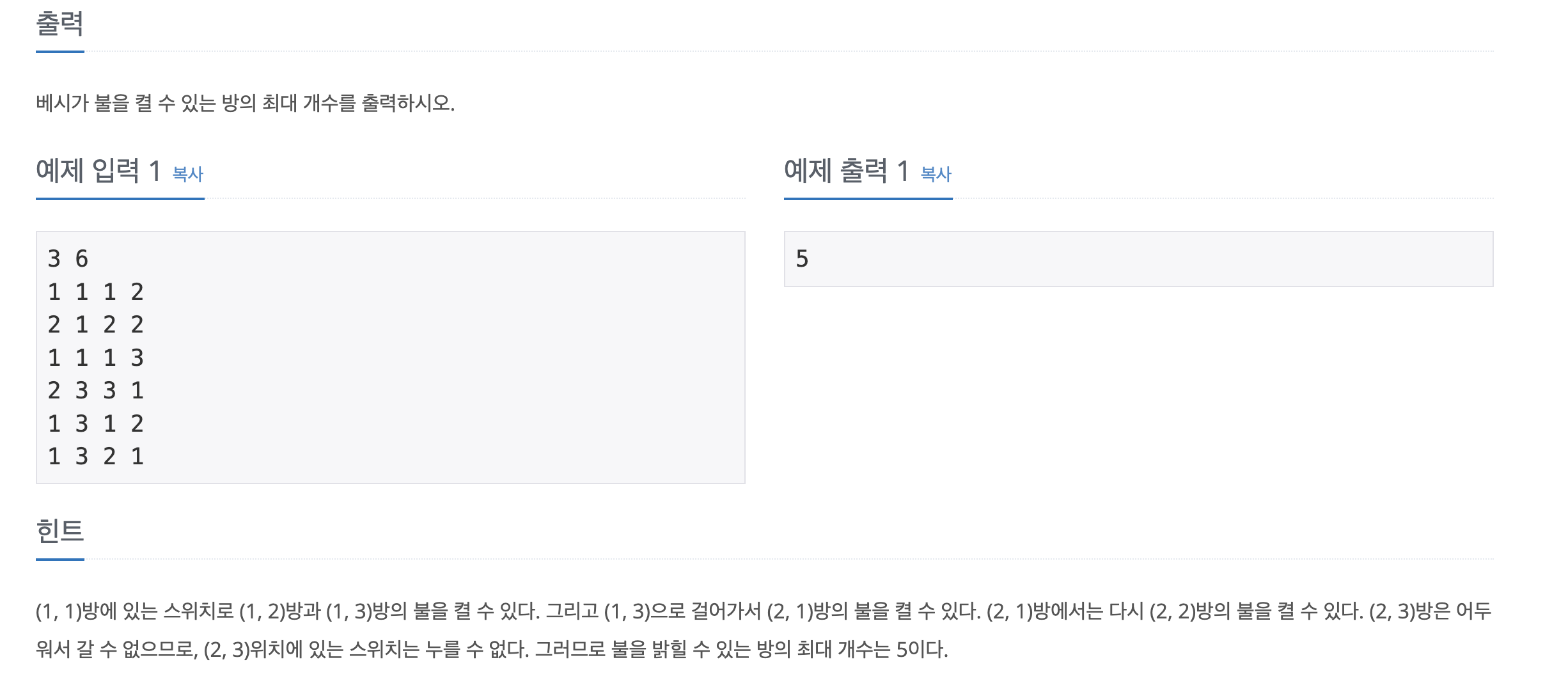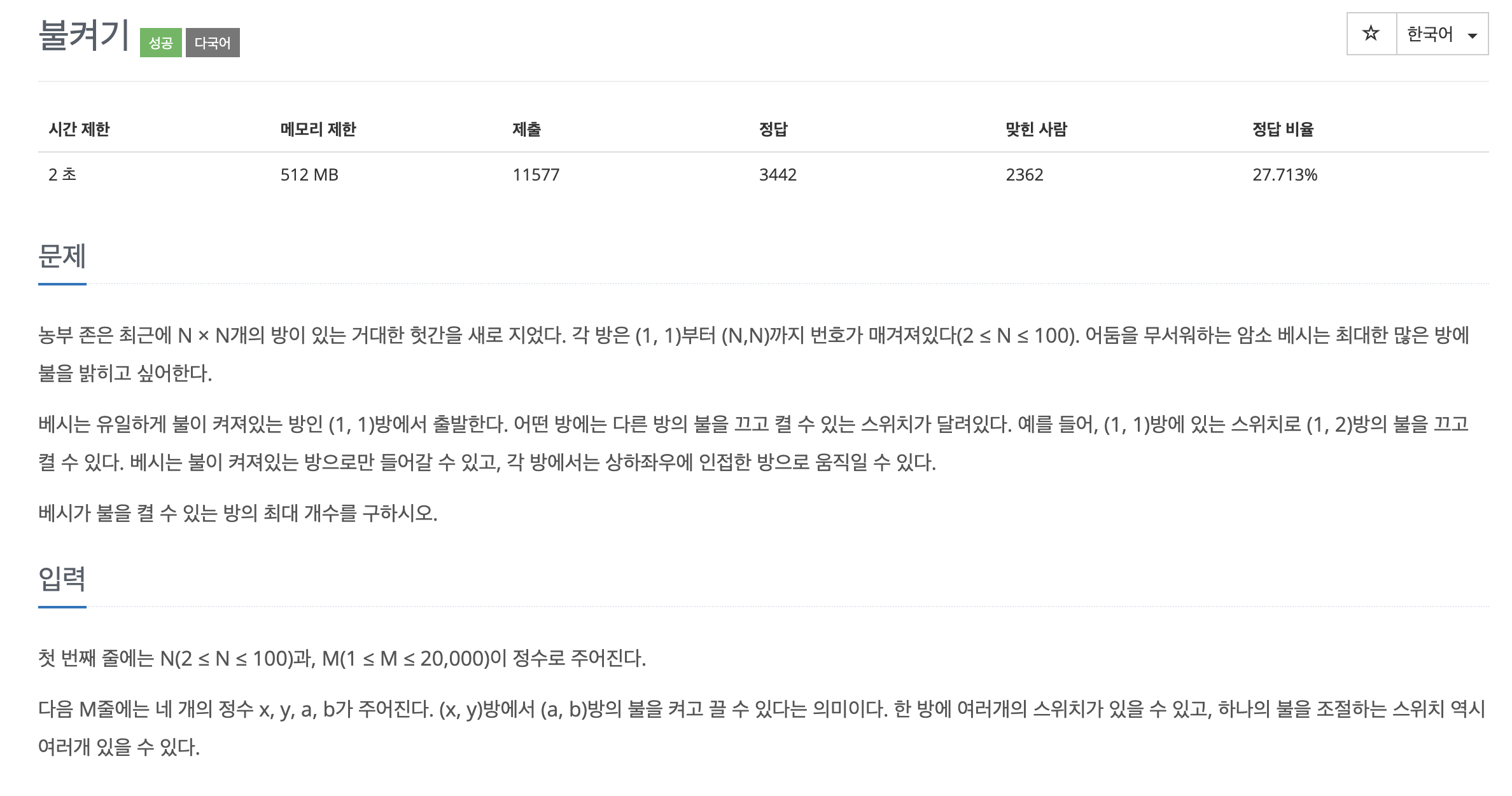 일단 이 문제는 문제를 잘 읽어야 한다는 것을 "맞았습니다!"를 받고 알게 되는 문제이다. 대충 시간복잡도랑 불 켤 수 있는 방을 찾으면 되겠다해서 BFS를 기계적으로 구현하면 바로 틀리게 된다.